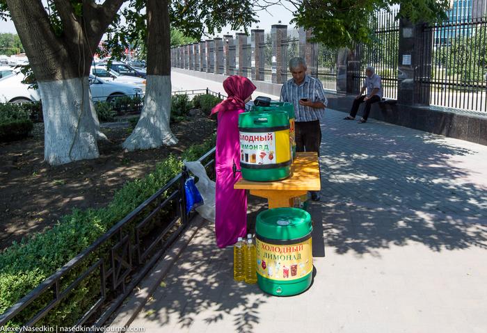 8. 40 градусов в тени! Самое время прохладиться. Квас и лимонады в городе продают чуть ли ни на каждом шагу, вот в таких специальных кегах. Впрочем, есть и классические квасные бочки ещё советских времён.