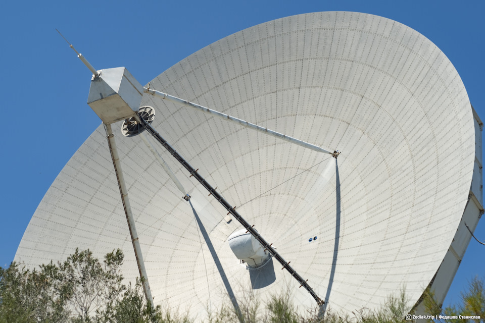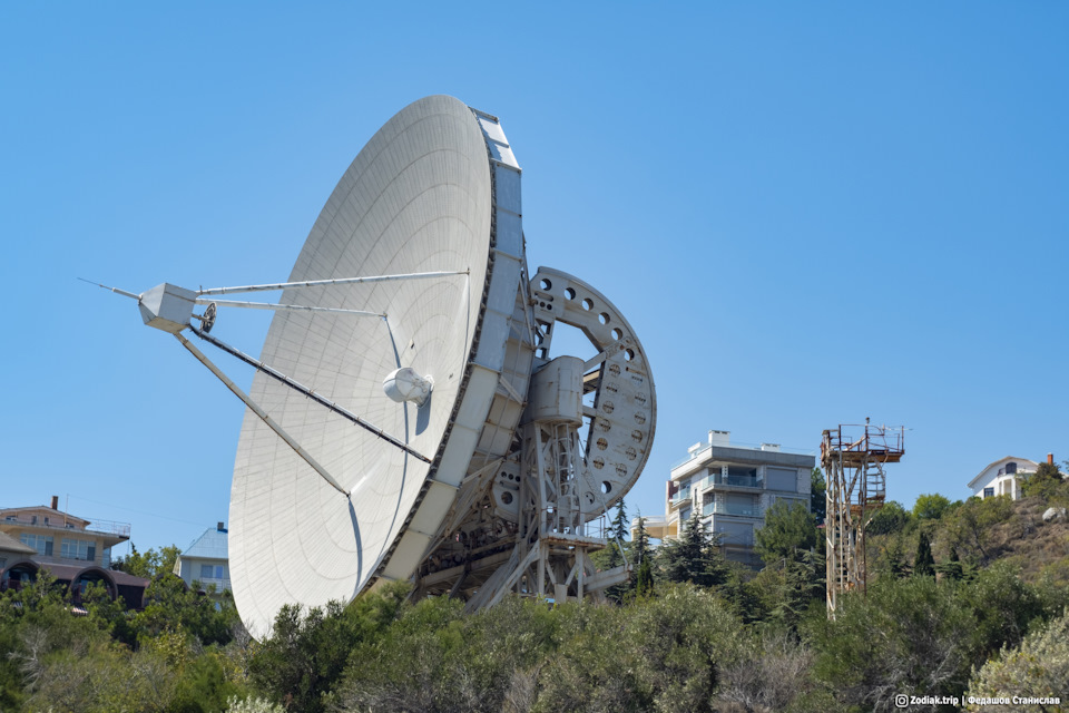 Рядом с радиотелескопом скромно расположились служебные корпуса Черноморского гидрофизического полигона РАН и телескоп Цейс-1000, который используется для астрономических исследований.