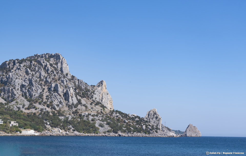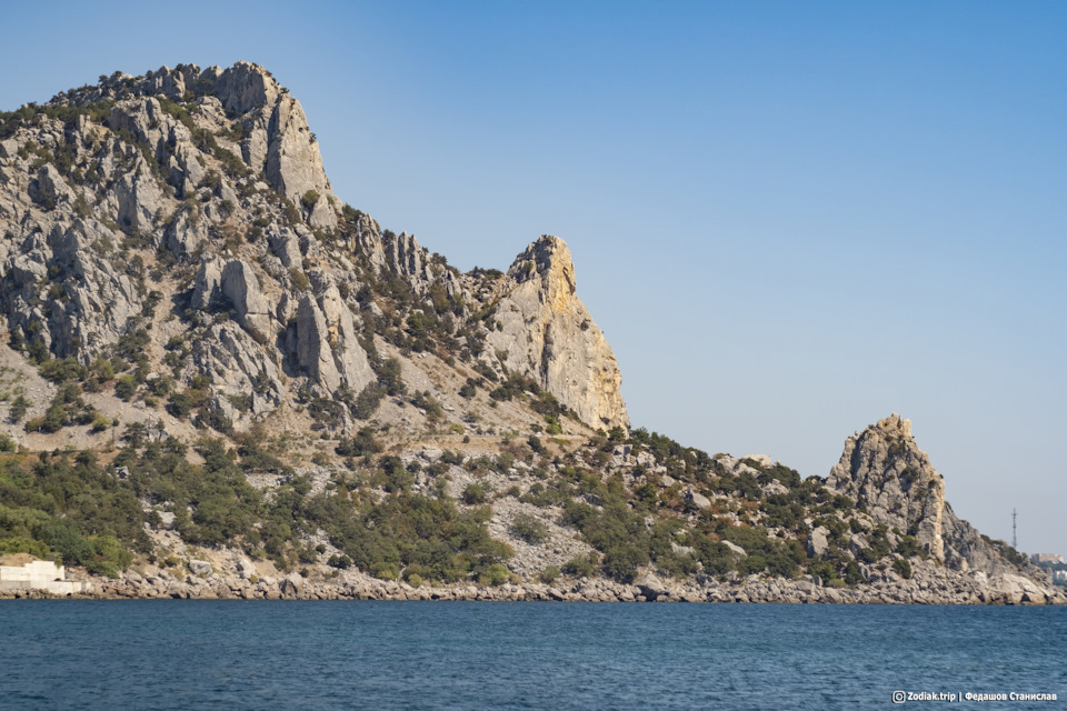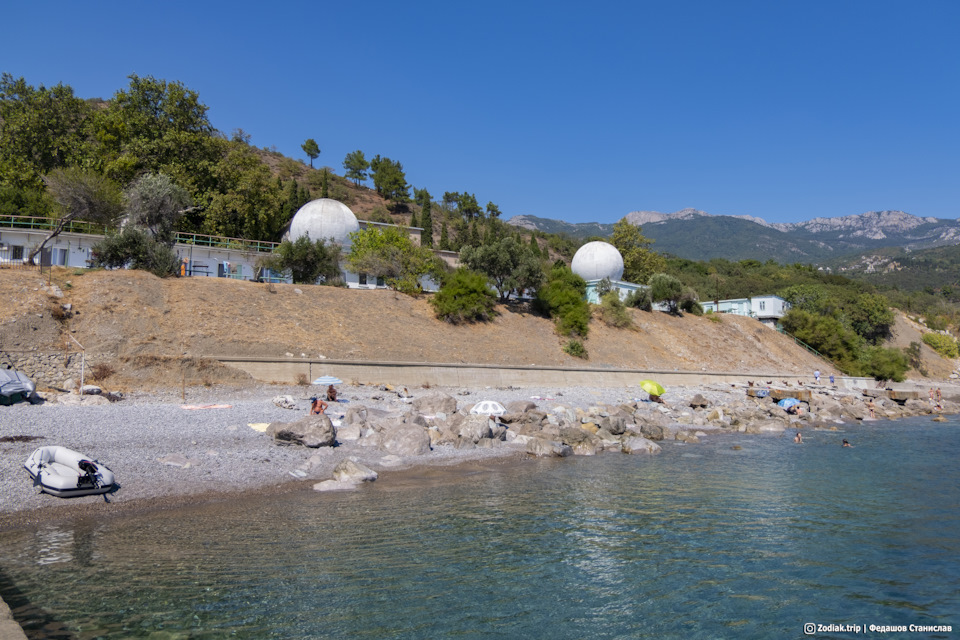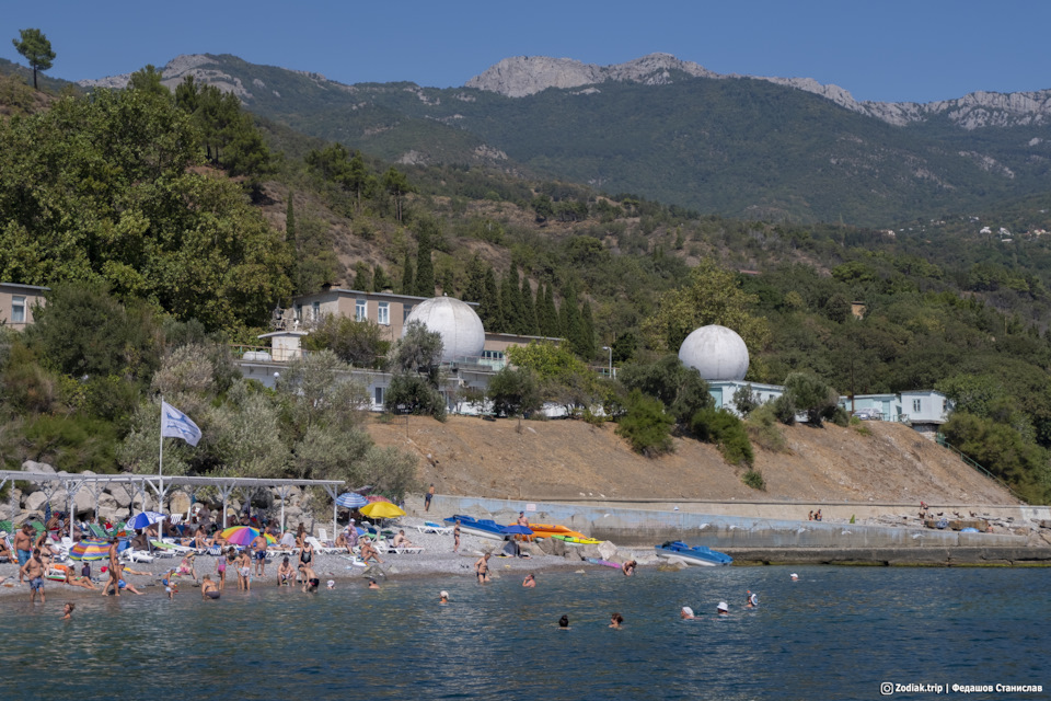 Панорама с этого пляжа не совсем обычная. Отсюда открывается вид на прибрежный аквальный комплекс у скалы Дива и горы Кошка, что находятся в пгт. Симеиз.