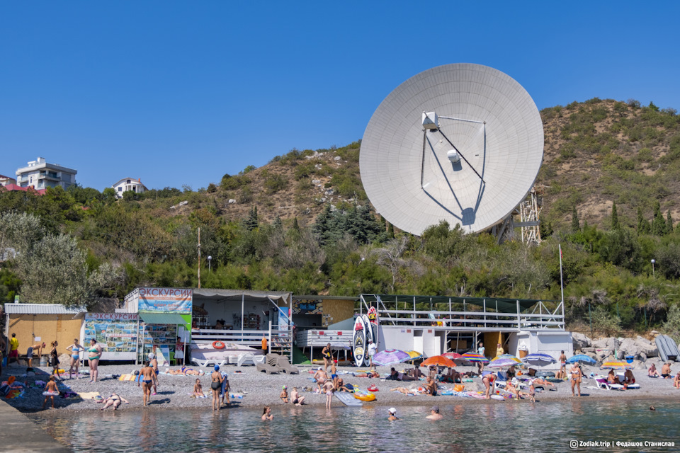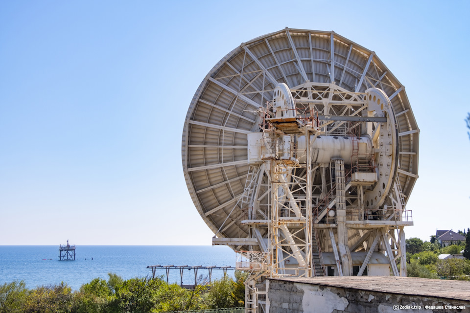 Отошел подальше от пляжа по бетонному понтону. Окинул взором пляж с огромным локатором, впечатляет! Честно сказать, я был не подготовлен к такому повороту. Оказывается, что это наследие прошлого — двадцатидвухметровый радиотелескоп РТ-22. Название говорит само за себя — диаметр тарелки 22 метра!