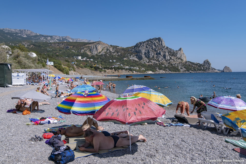 Пришли мы на местный пляж, с виду пляж и пляж — обычный галечный, небольшого размера. Народу достаточно, но место найти можно.