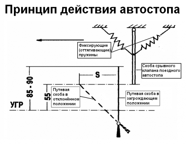 Рабочим органом поездных устройств автостопа является скоба пневматического срывного клапана, которая фиксируется в вертикальном положении двумя оттягивающими спиральными пружинами. Рабочим органом путевых автостопов является путевая скоба, устанавливаемая с правой стороны по направлению движения на расстоянии 308 плюс-минус 20 мм от внутренней грани головки рельса с возвышением 85 плюс 5 мм над уровнем головок рельсов. При нахождении путевой скобы в заграждающем (вертикальном) положении происходит взаимодействие (удар) скобы пневматического срывного клапана с путевой скобой. В результате такого взаимодействия скоба пневматического срывного клапана отклоняется от вертикального положения, что приводит к открытию клапана тормозной магистрали и экстренному торможению. Аналогично происходит взаимодействие скобы пневматического срывного клапана с неподвижными скобами, устанавливаемыми перед тупиковыми упорами на станционных путях. На линиях, где основным средством сигнализации является АЛС-АРС, для исключения проезда светофора полуавтоматического действия, имеющего запрещающее показание, в рельсовые цепи перед и за этим светофором подается сигнал абсолютной остановки (АРС-АО). При приеме этого сигнала поездными устройствами АЛС-АРС автоматически приводится в действие тормозная система поезда и исключается начало его движения.