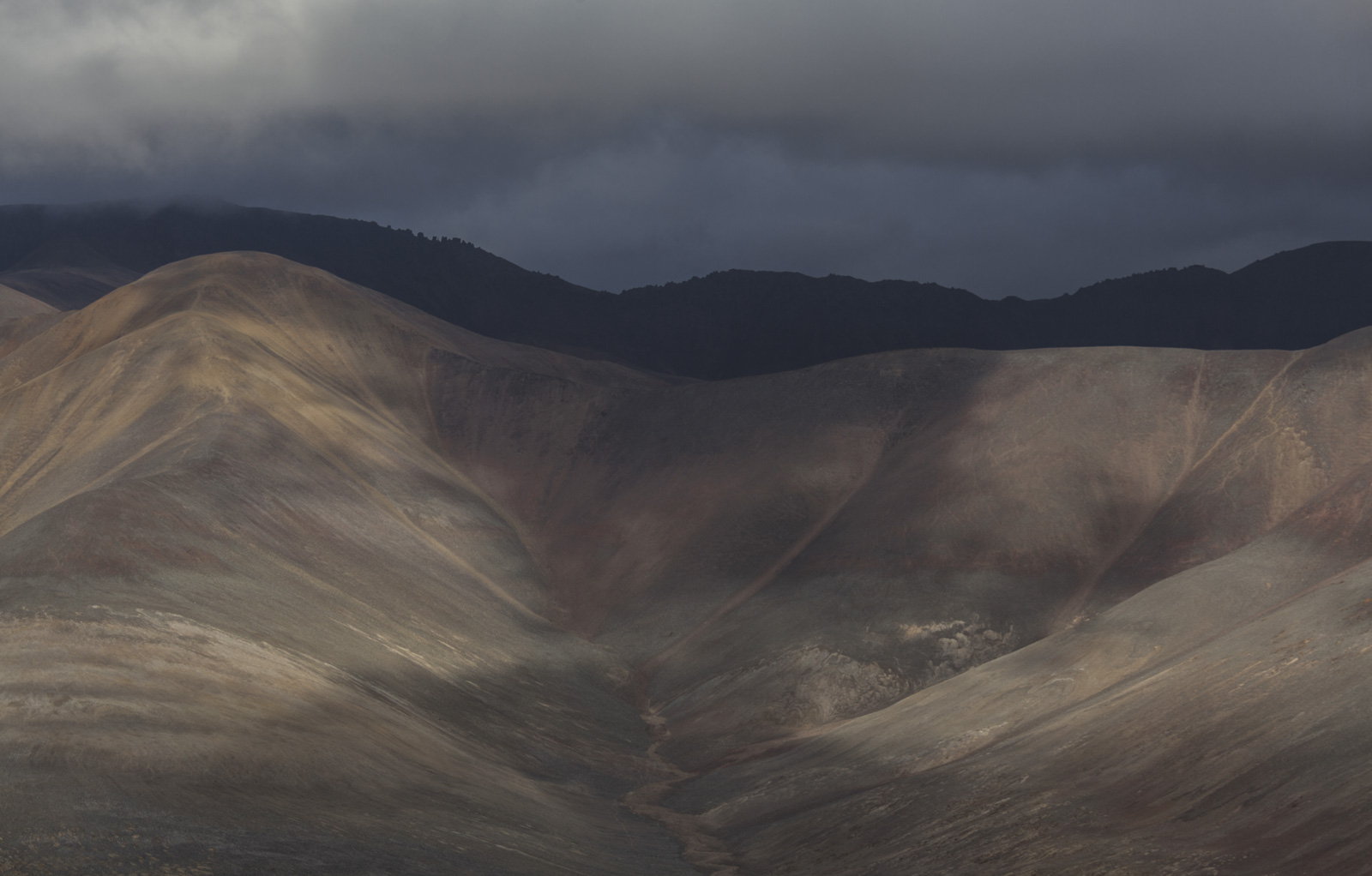 На Красном вершина горы сформирована розовой окаменелой глиной. Вокруг черные сопки с зелеными проплешинами на боках, сделанными как будто хаотичным разбрызгиванием красок огромной кистью.