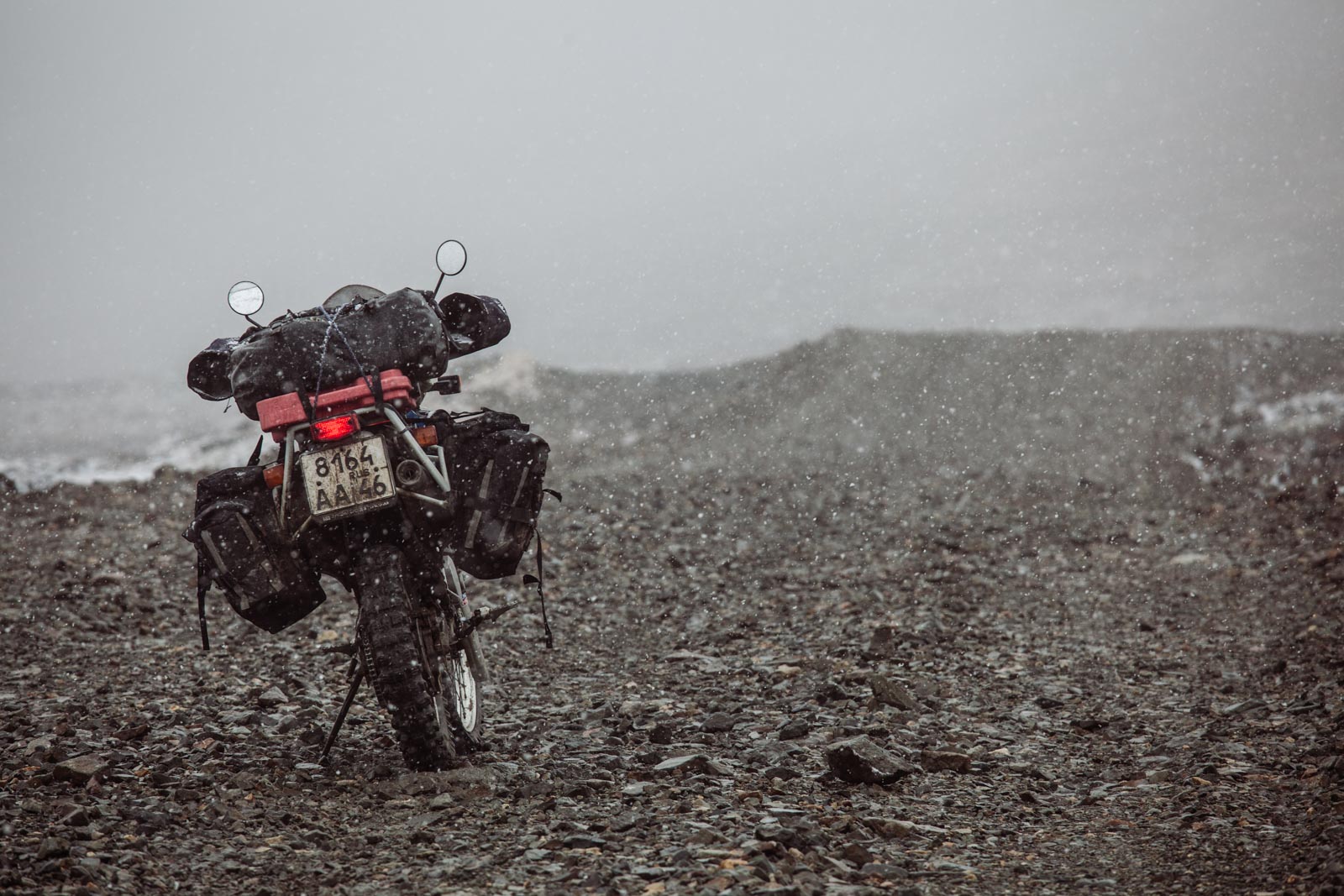 Прогулявшись, возвращаюсь к мотоциклу. Надеваю еще один слой одежды, на что погоде тоже есть, что мне ответить - выпадает снег.