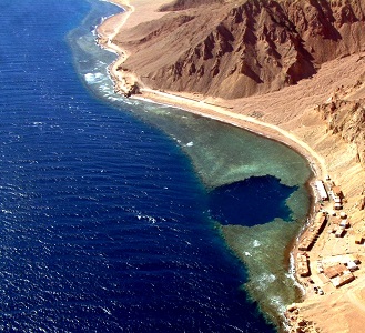 "Голубая дыра" (Blue Hole), которая находится недалеко от города Дахаб, недаром считается одним из самых загадочных и красивых мест Красного моря, но и одновременно одним из самых опасных в мире рифов для подводных погружений. Это уникальное коралловое отверстие в Красном море диаметром около 55 м, отвесно, в виде сужающегося колодца, уходит вниз на глубину до 102 м. "Голубая дыра" привлекает любителей дайвинга со всего света. Во время поездки можно поплавать, погрузиться с аквалангом, а после обеда покататься на верблюдах и посетить шопинг-центр города Дахаб.