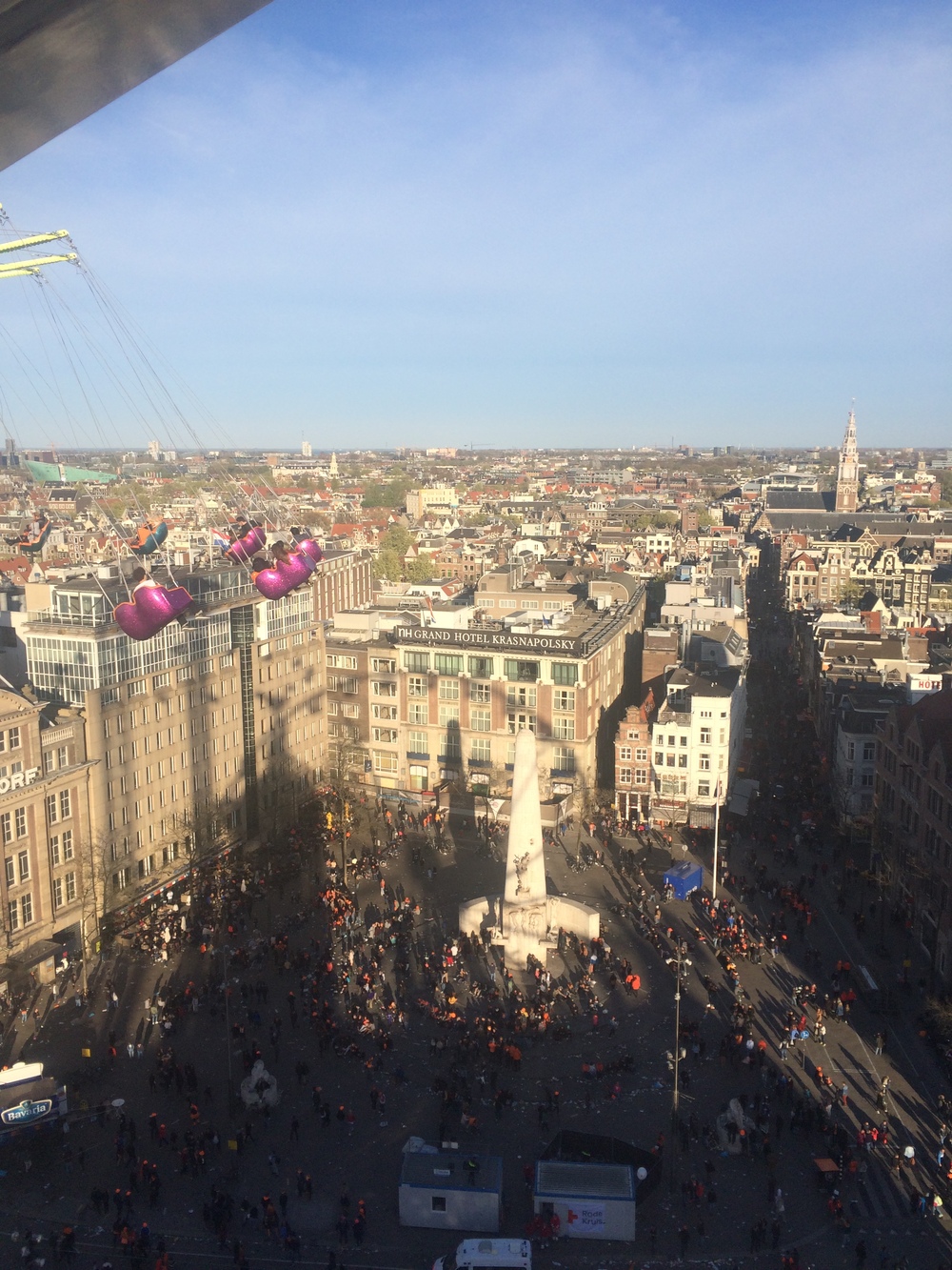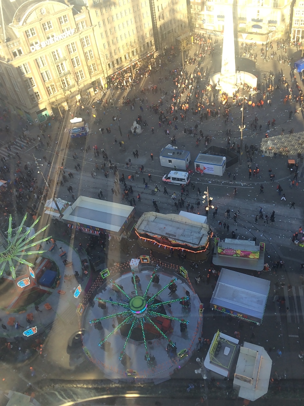 Посчастливилось попасть на празднование Дня короля, который считается самым грандиозным национальным событием в стране. Запомнился этот день веселой пьяной молодежью, громкой музыкой, блошиными рынками прямо на улицах города, ну и оранжевыми нарядами и аксессуарами. Специально к этому празднику на главной площади был выстроен парк аттракционов. Туристов тоже хватало (подозреваю, что их было больше, чем местных). Магазины не работали. Еще одна особенность этого праздника, наверное, именно в том, что это ДЕНЬ, а не ночь Короля ) Все шумные мероприятия пришлись на дневное время 12-16 часов дня. Вот что я наблюдала из окна, не выходя из дома: