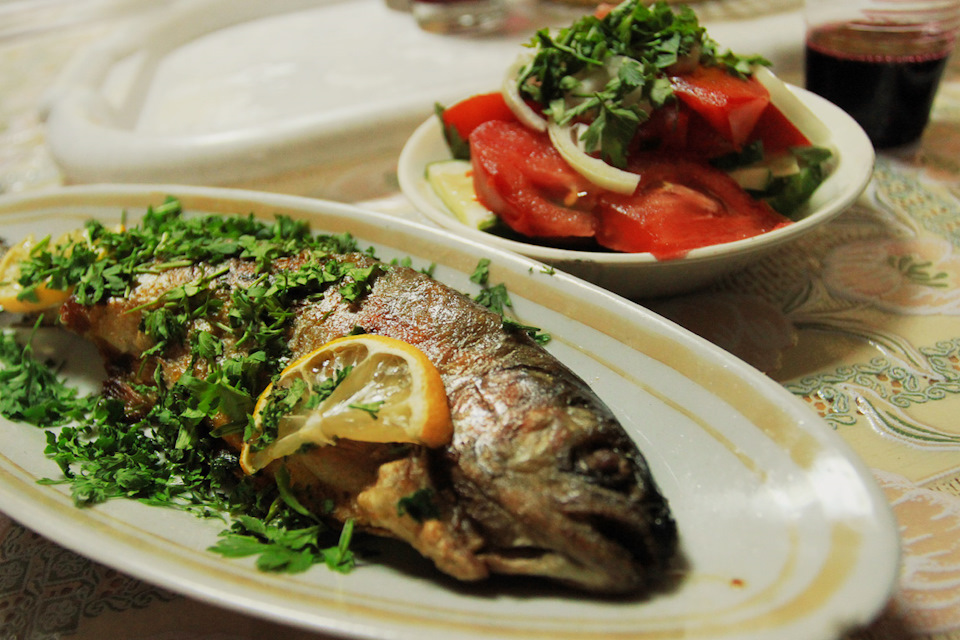 Вечером ходим гулять к морю, предварительно подкрепившись свежей рыбкой. Недалеко от Головинки рядом с достопримечательностью 33 водопада есть свое форелевое хозяйство (43.838368, 39.557549) — так что рыбка здесь вкусная свежая, особенно запеченная на углях, да со свежими овощами. Отличный ужин!