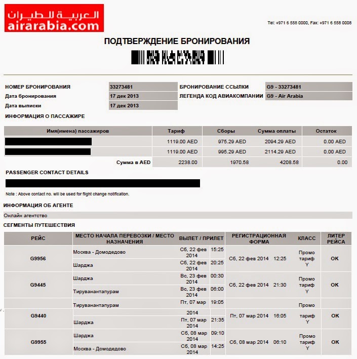 Существуют и более дорогие варианты. Так, Etihad Airways совершит перелет с пересадкой в Абу-Даби от Москвы до Тривандрума и обратно на 8 часов быстрее, но на 4-8 тысяч рублей дороже. Emirates Airlines с пересадкой в Дубае будет стоить 29000-37000. Мы выбираем самый дешевый вариант Air Arabia: 19000 рублей на человека туда обратно, покупаем билеты через сайт авиакомпании.