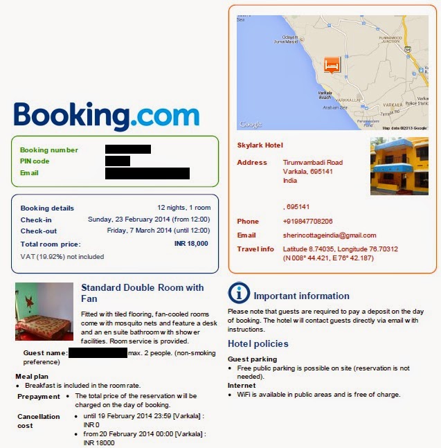 9000 рублей за 12 ночей. На месте можно найти гораздо лучше и за меньшие деньги, так как даже в отелях за стоимость номера можно и нужно торговаться. В Варкале можно найти и комнату за 300 рупий (5 долларов) в сутки и дорогой отель. Путешествуя по разным городам, мы останавливались в отелях за 700-900 рупий, самый дорогой, но очень хороший бизнес отель в Кочи обошелся нам в 2300 рупий.
