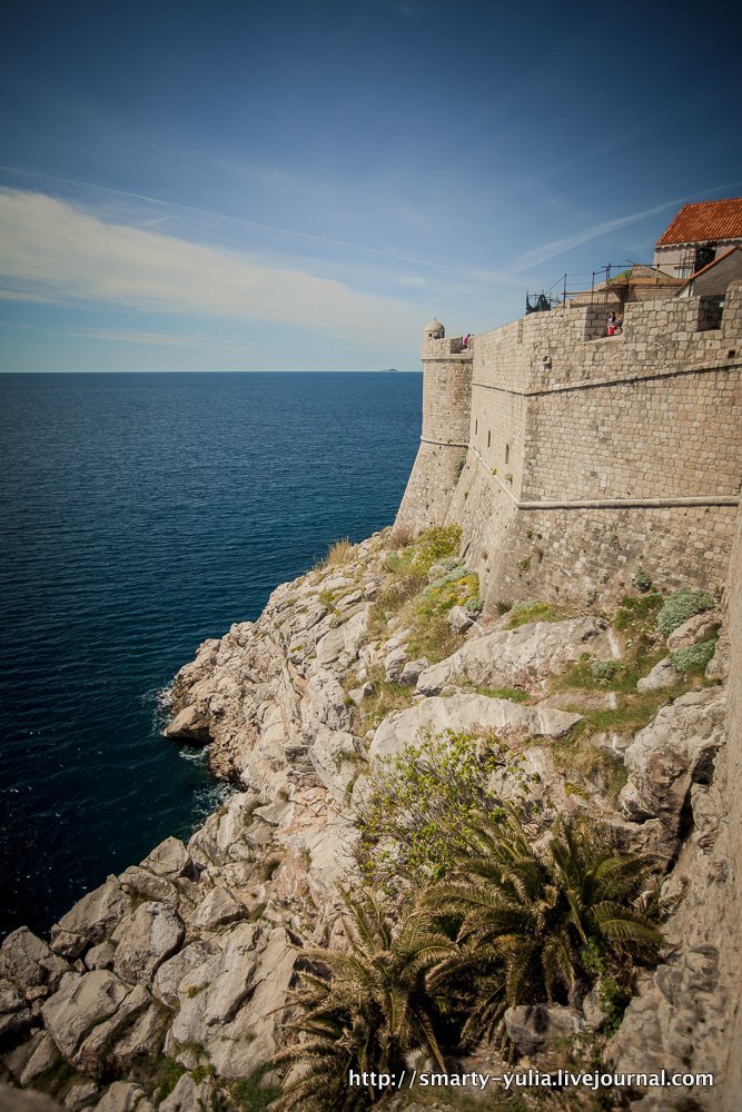Дубровник — очень дорогой город! И даже в несезон там было очень много людей! Мы чудом нашли парковку. Старый город Дубровника окружен великолепной крепостной стеной, по верщине которой можно прогуляться, увидев весь город с высоты! Что мы и сделали! Неспешная прогулка заняла около 1,5 часов! Даже в первых числах апреля было жарко, у меня и у смуглого мужа лица в итоге немного обгорели. Думаю, летом тут гулять вообще невозможно от жары!