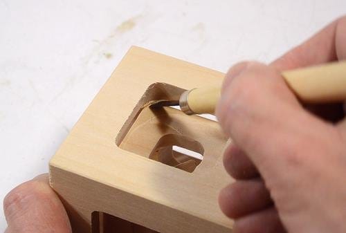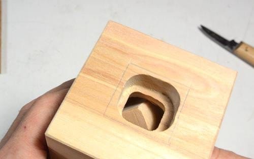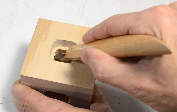 Сначала мастер решил вырезать внутренний куб. Но прежде чем вырезать внутреннюю поверхность ласточкиным хвостом, мастеру требовалось освободить место для удобства вырезания в дальнейшем среднего куба. Поэтому он использовал 19 мм прямоугольное долото с меньшим шаблоном для вырезания менее глубокой части полости, чтобы освободить место.