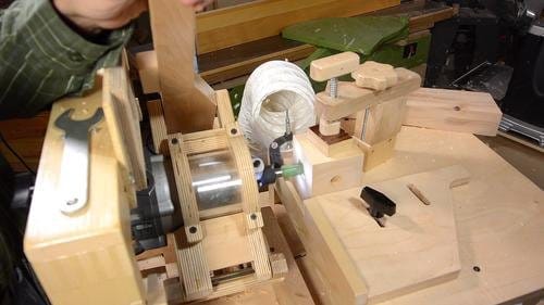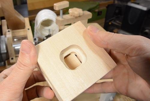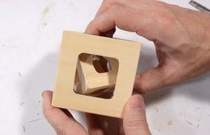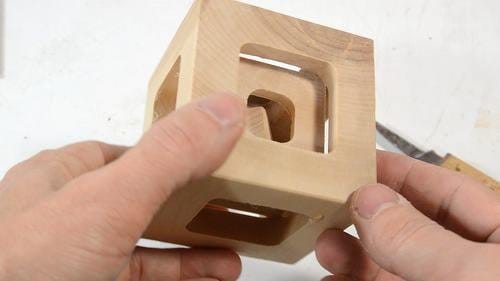 После фрезерования всех четырех сторон куба, мастер срезал материал с углов с помощью разделочного ножа, чтобы освободить внутренний куб. Материал, на котором держался куб был меньше, чем был бы, если бы мастер использовал круглые коронки. Однако углы отверстий все еще остаются закругленными и слегка удерживают куб.