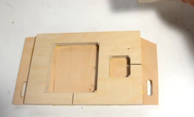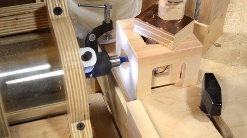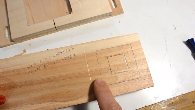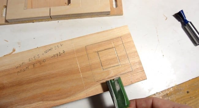 В дополнение к этому, мастер решил сделать квадратные отверстия с помощью долота для пантороутера "ласточкин хвост", чтобы отверстия были больше изнутри. Для этого был заготовлен шаблон.