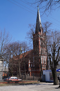 Мои новые знакомые в скором времени собирались в направлении башни Бисмарка и предложили мне место в их машине. Договорились встретиться в сквере через полчаса. В отпущенное мне время бегу в Католическую церковь — один из ее шпилей вы заметите сразу же, как войдете в сквер. В будни она начинает свою службу после 5 вечера, раньше внутрь не попасть — калитка на клюшке. Пока лишь любуюсь ее фасадом и бегло осматриваю центральные улицы вокруг.