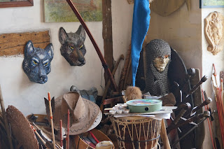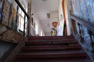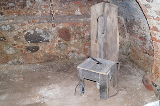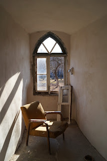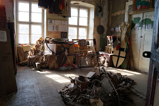 Завидев гостей они поспешно ретируются, оставив нас в некотором недоумении. Предзамковая вывеска гласит, что в замке есть музей, который мы так и не нашли. На территории замка весьма неудачный ремонт: из-за протекающей крыши свеженанесенная штукатурка активно покидает стены. Из предметов мебели находим стул советского периода,