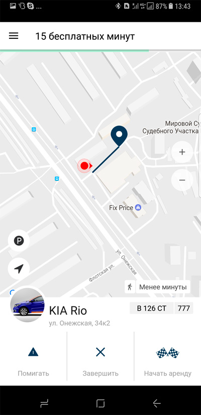Запустил приложение - обнаружилась машину где-то в пяти минутах ходьбы. При этом на карте показывается, как к ней идти. И после бронирования есть еще бесплатные минуты ожидания на то, чтобы до этой машины дойти (в данном случае было 20 минут, я не знаю, это как-то зависит от расстояния до машины или нет).