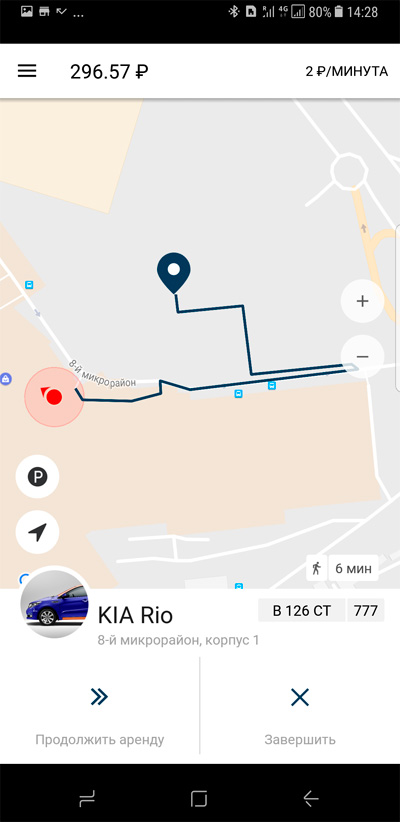Ну и после этого - заводишься да едешь, куда надо. Когда приезжаешь на место, двигатель выключаешь, ключ не вытаскиваешь, в приложении машину переводишь в режим ожидания - это 2 рубля минута. (Народ пишет, что дороговато.) Поездка - 8 рублей минута.