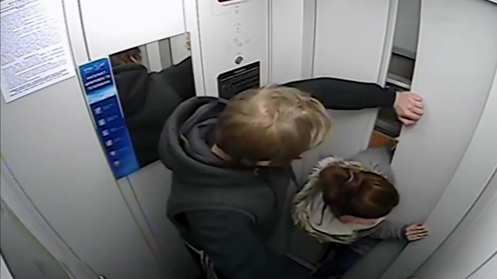 Девятиэтажный дом. Люди едут в лифте, улыбаются, и вот уже не до смеха: кабина стала падать. К счастью, пассажиры не пострадали.