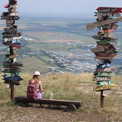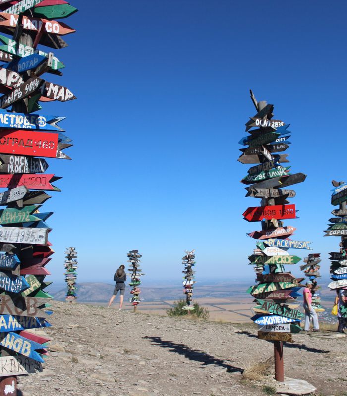 Немного левее стоят самодельные указатели на разные города мира, сделанные руками туристов.