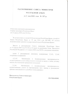 « 2 мая 2020 года на портале правительства Республики Крым было размещено Распоряжение правительства Республики Крым № 557-р о внесении изменений в Распоряжение правительства Крыма от 14 апреля 2020 года № 444-р, которым, напомню, были определены субъекты, чья деятельность не запрещена на территории Республики Крым.
