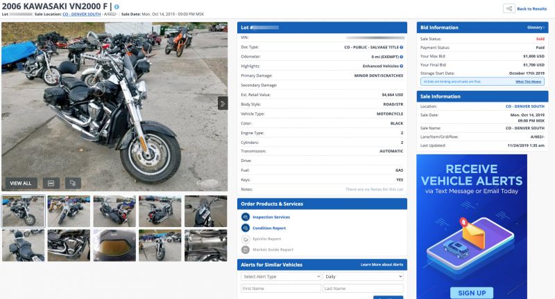 Возьмем еще для сравнения Kawasaki VN2000 F 2006 года выпуска, приобретенный на американском аукционе за $2 128. Учитывая все расходы, его примерная цена — $4 360 (или $3 995 при условии льготной растаможки). Ради интереса посмотрели, сколько стоят похожие предложения на нашем сайте. Есть экземпляр 2009 года с четырехтактным двигателем объемом 2 053 см3 и пробегом 7 500 миль за 6 тысяч долларов. Или крейсер Vulcan 2000 2007 года, за который хотят выручить $7 600.