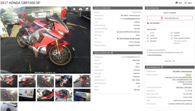 | Трехлетний спортбайк Honda был куплен за $8 408 (со всеми расходами — за $12 848) |