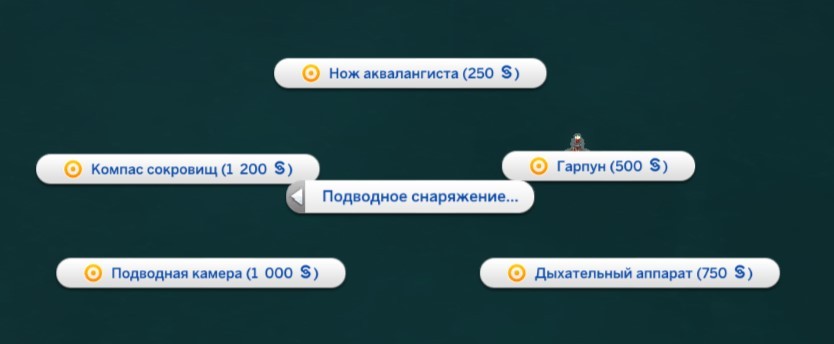 А вот около глубоководных буйков вы можете прикупить снаряжение для погружения: Нож, позволяющий вам собирать ракушки, дыхательный аппарат, который позволяет вам погружаться на более длительное время и доставать больше плюшек, камеру, чтобы делать фотографии, гарпун для подводной рыбалки, и компас, чтобы искать сокровища