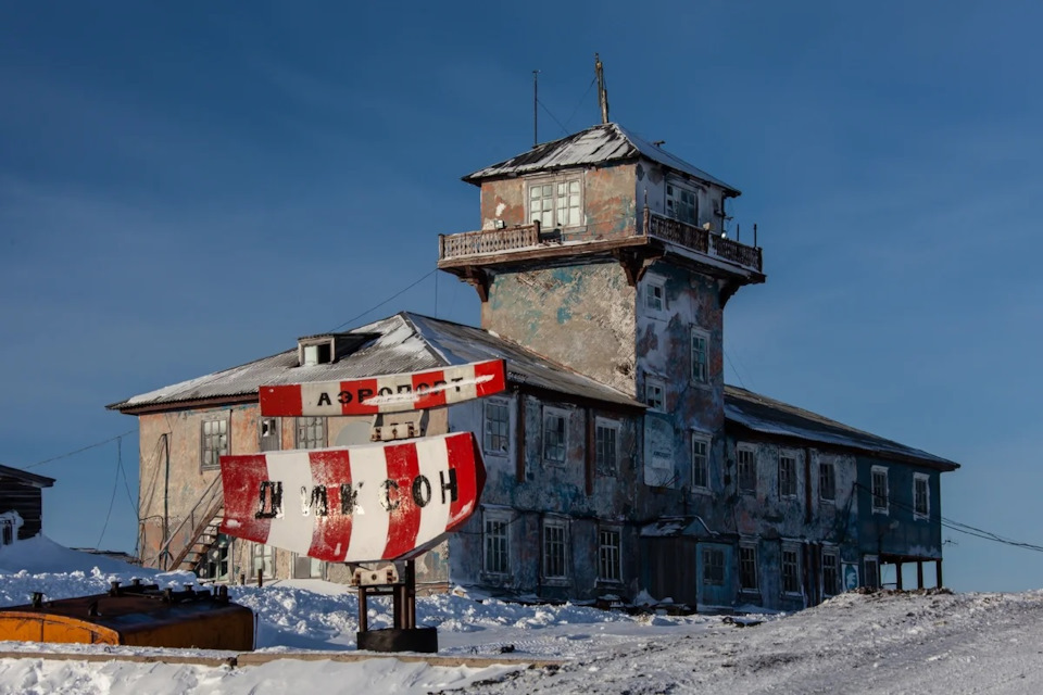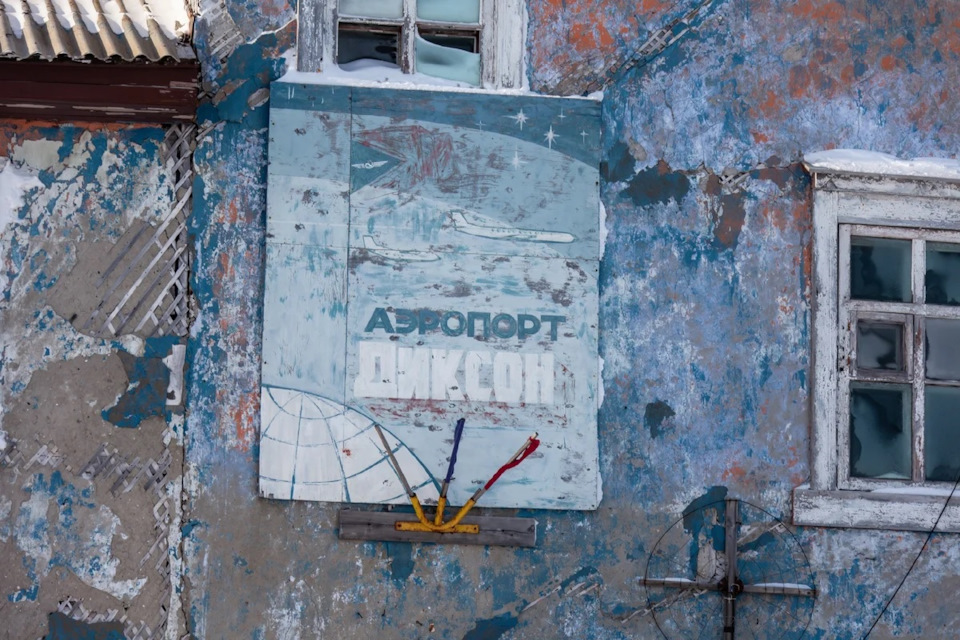 Но больше всего меня поразило здание аэровокзала. Ободранное, с отваливающимися кусками штукатурки, окнами, набитыми снегом, облупившейся краской на раме и выцветшей краской на вывеске "Аэропорт Диксон"