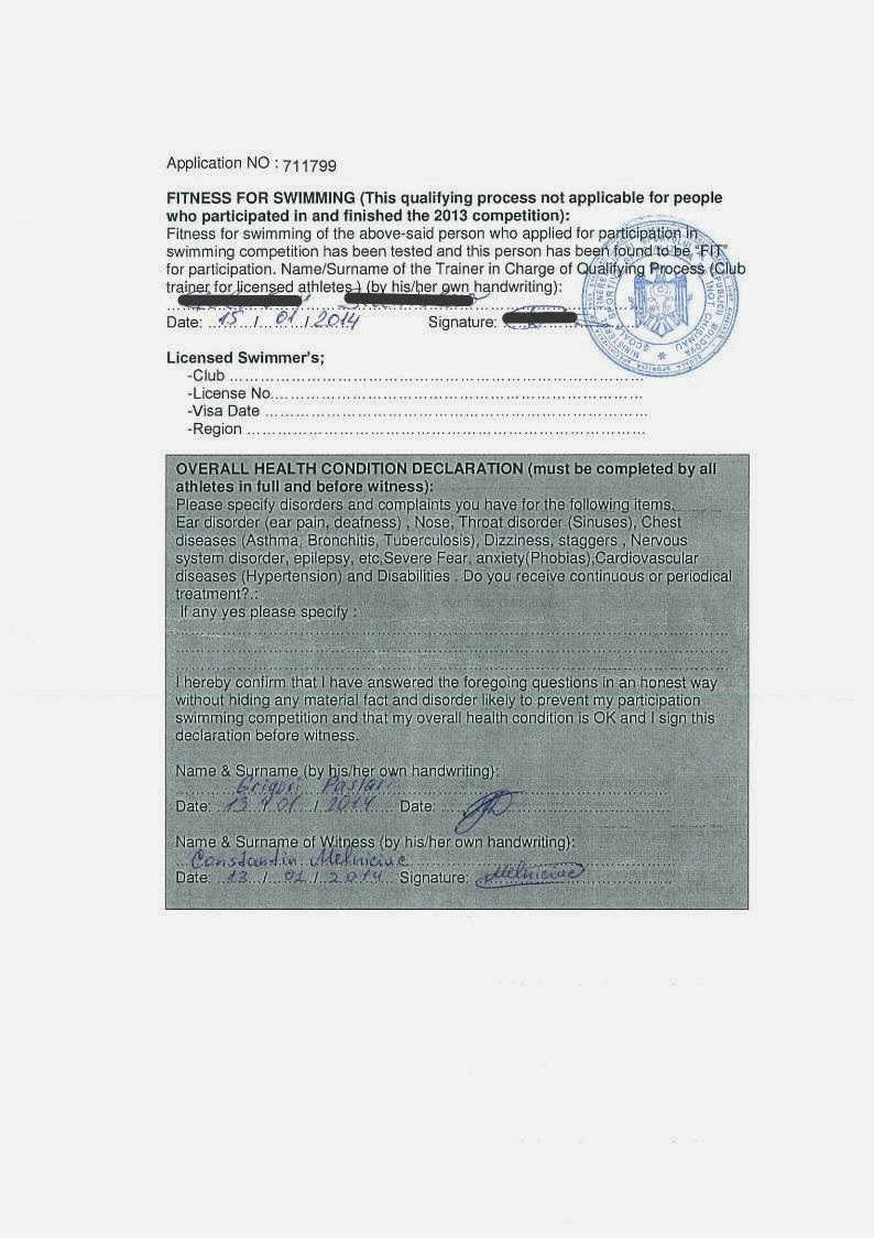 На первом листке надо лишь указать дату и подпись, подтверждая, что вы физически здоровы, в состоянии проплыть эту дистанцию и снимаете с организаторов какую-либо ответственноесть за вероятные проблемы.