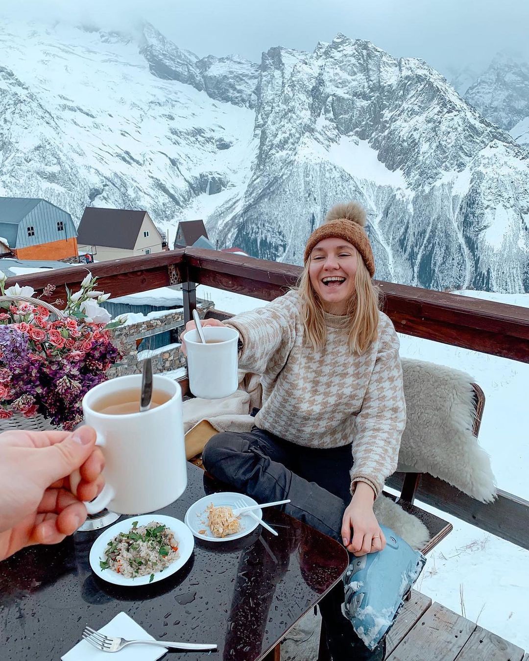 После вернемся на поляну Азау, чтобы согреться ароматным чаем или глинтвейном в самом высокогорном кафе России.