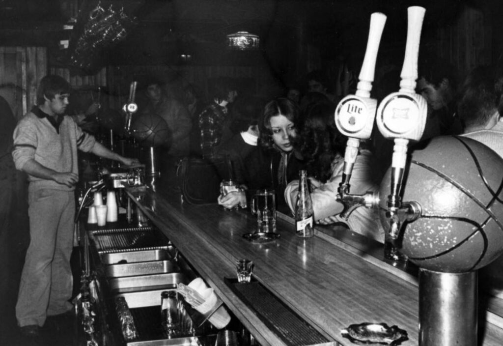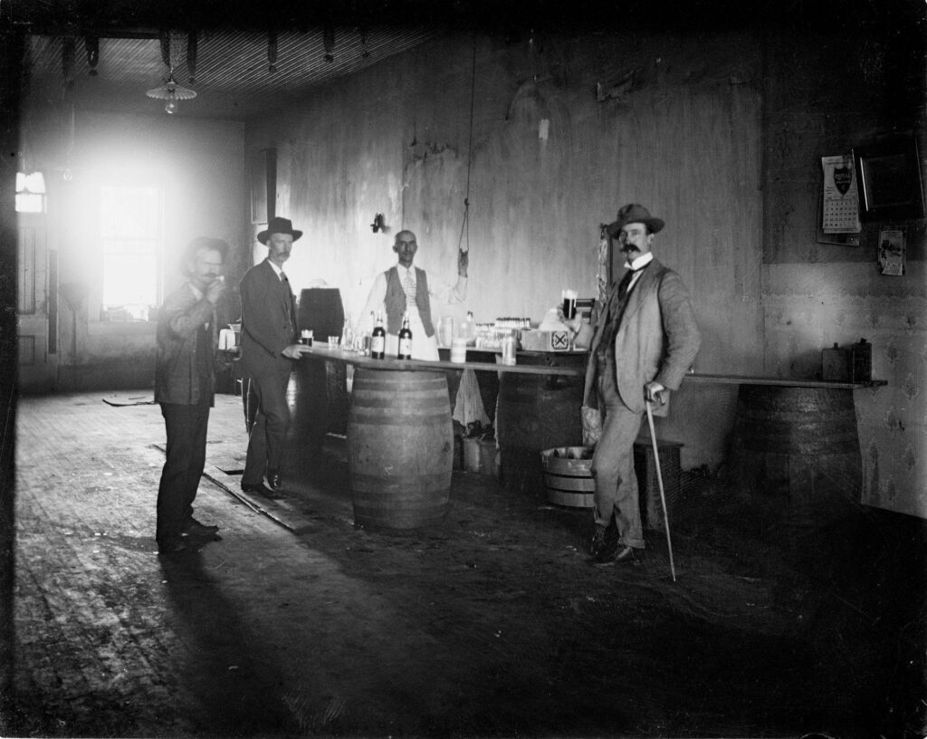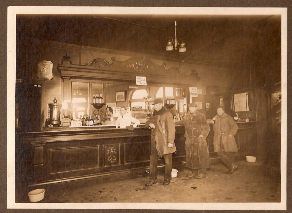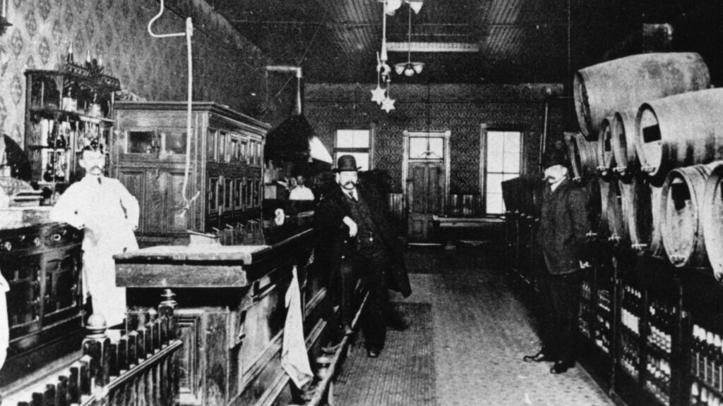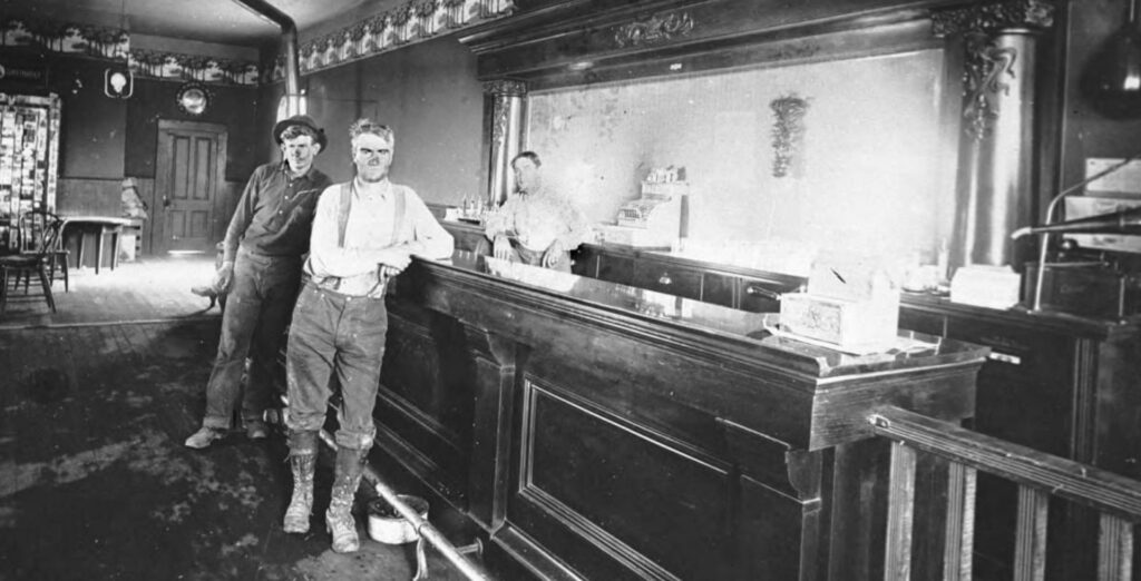А вот уже настоящий бар с настоящей барной стойкой из массива дерева (это называется front bar) зеркалом, декоративными колоннами и кассовым аппаратом (это называется back bar), у барной стойки даже есть упор для ног и плевательница (для удобства кастомеров). В таких барах появляются и прародители современных барных станций. Их тогда называли проще: work board или work area, а иногда и вообще просто inside, то есть, то, что внутри бара.