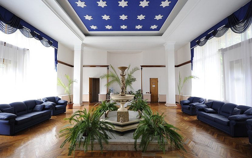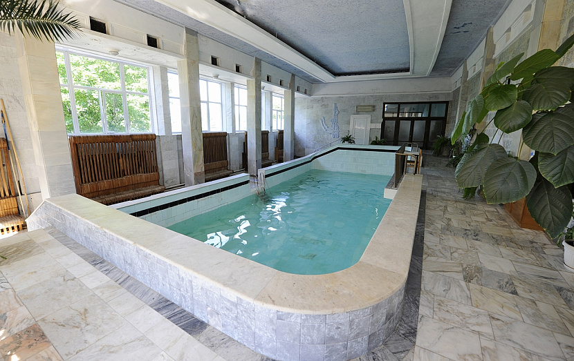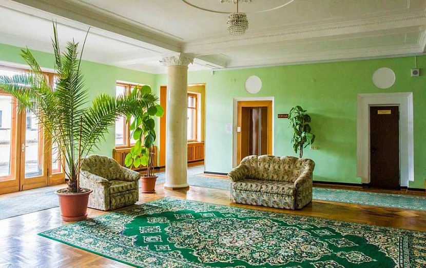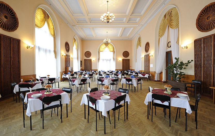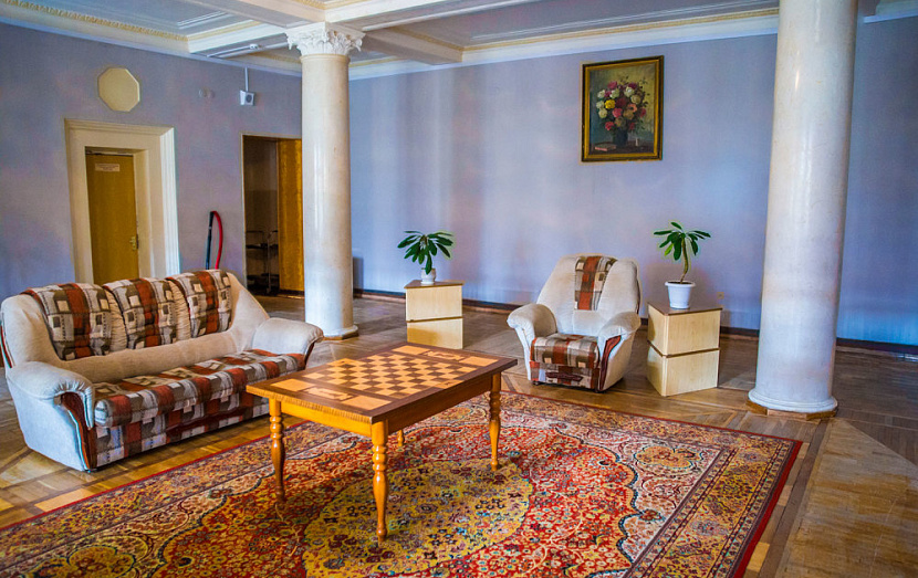 Социалистический дворец был престижным местом отдыха в Советском Союзе — еще бы, простой рабочий такой роскоши даже представить себе не мог! Архитектура в стиле Палладио эпохи Ренессанс, богатая лепнина, массивные колонны, шикарные лестницы, невесомые арки, чьи своды расписаны мастерами Палеха и Мстеры. Говорят, в санатории подавали черную икру и осетрину.