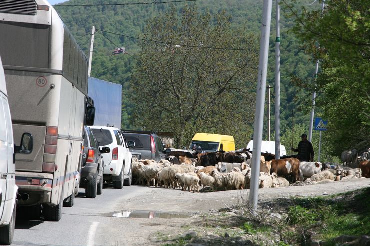 При переходе границы на автомобиле, на Кавказе возможно два варианта. Первый: терпеливо стоять в очереди. Второй – хамский. По встречке нестись к КПП, а там – по ситуации. Учитывая, что на двухрядной дороге в каждую сторону движется по две колонны – фуры и остальные автомобили – то зрелище это крайне занимательное. Которое мы, выбрав первый вариант, три часа наблюдали, стоя в очереди. Перед тем, как сделать окончательный выбор, я прогулялся с полкилометра вперед. Размялся, а заодно получил много полезной информации. Из разговора с местными водителями выяснилось, что сегодня лучше постоять, так как скоро нагрянут гаишники. У одного из аборигенов имелась рация, и он слушал все переговоры служивых. Так и получилось. Минут через 40 промчались несколько экипажей ДПС, а за ними автобус с военными. А дальше начался разгон автохамов, которые не пожелали стоять в очереди. Действо сопровождалось темпераментной кавказской руганью, маханием рук, лихими плясами и т.д. В результате, большинство нарушителей с позором выгнали в хвост очереди. А сама очередь пошла динамичнее.
