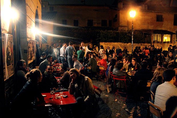 В Трастевере вообще очень здорово гулять по узким переулкам, изредка заходя выпить и подкрепиться в какое-нибудь кафе. Они тут на каждом углу. Правда, с ростом курса евро кутить в Европе стало труднее. Тем, кто хочет дёшево и сердито, советуем заглянуть в бар Freni e Frizioni с 7 до 10 вечера. Это заведение, открытое на месте старой автомастерской, радует не только душевной атмосферой, но и вечерним aperitivo. В это время, купив одну порцию алкоголя (от 6 евро), вы получаете неограниченный доступ к шведскому столу. Есть несколько видов паст и ризотто, салат и фрукты — достаточно, чтобы плотно поужинать.