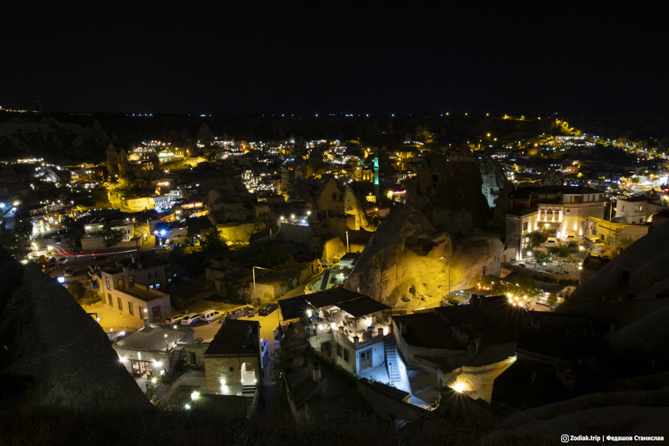 Ночная Каппадокия напомнила мне городок из мира фантастики. Практически полное отсутствие привычных нам зданий; отраженный от туфовой породы свет создает эффект нереальности происходящего. Как будто мы находимся в одном из городов Татуина, к примеру. Вот-вот из грибообразных домов выйдут интересного вида существа и заговорят на непонятном языке :)
