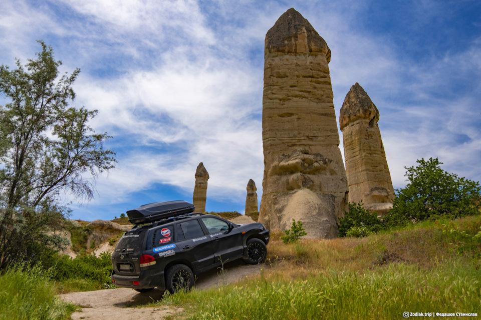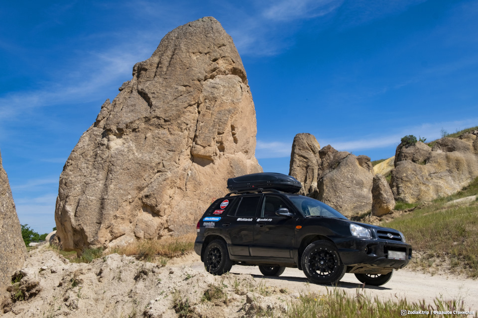 Вот они, те самые туфовые столбы со шляпками из черного базальта, про которые я говорил. Для сравнения подъехал на автомобиле к столбу, чтобы было понятно, насколько они высокие.