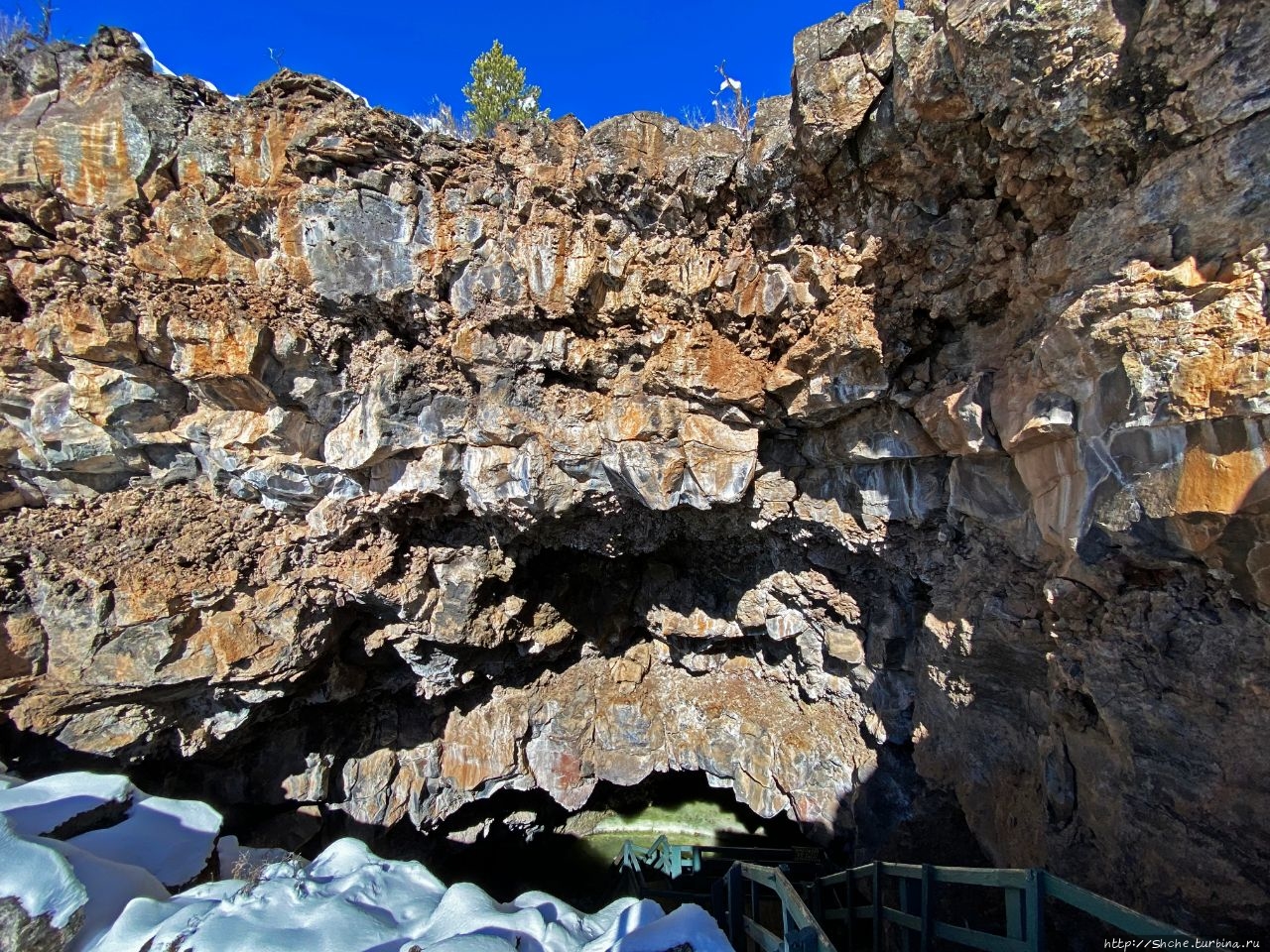 Конечно, я не в первый раз оказался на лавовых полях, но не припомню места, где эти поля оказываются покрытыми снегом. реально редкое зрелище! Даже жаль, что до пещеры идти всего-то четверть мили (или около 400 метров). Вот мы уже на краю довольно глубокой воронки, внутрь которой ведет деревянная лестница.