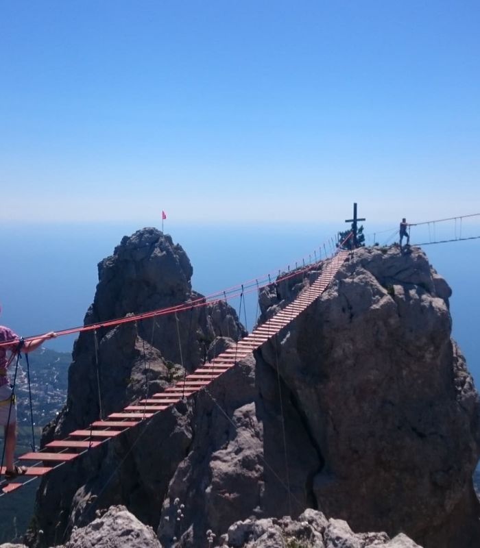 После обеда нас ждёт уникальная канатная дорога Мисхор-Ай-Петри (Факультативно, за доп. плату канатная дорога на Ай-Петри или проезд на микроавтобусе – взр.-1000 руб., дети 6-12 лет -500 руб.). Желтый вагончик канатной дороги приветливо примет нас на свой борт и, мягко покачиваясь, заскользит на вершину горы. Вершина каждый раз удивляет своим непредсказуемым характером, но дарит незабываемые впечатления в любую погоду. Удовольствие доставит как ясный день, когда море просматривается дальше, чем на 100 километров, так и пасмурный, когда разглядывать побережье можно сквозь разрывы в облаках. Ай-Петри откроет не только объемную панораму Южного Берега с утопающими в зелени посёлками Большой Ялты, но и покажет дорогу в свои недра. С мая по октябрь у любителей экстрима есть возможность спуститься в одну из трёх Ай-Петринских пещер. (Факультативно, за доп. плату, продолжительность 30 мин., билет: взр.-200 руб., дети 6-12 лет-150 руб.) или, совершив 20-минутное восхождение на самую верхнюю точку горы, пройти по подвесным мостам на зубцах Ай-Петри над пропастью на высоте 1234 м над уровнем моря (Факультативно, за доп. плату, продолжительность 5 мин., билет: взр./детск.-700 руб.)