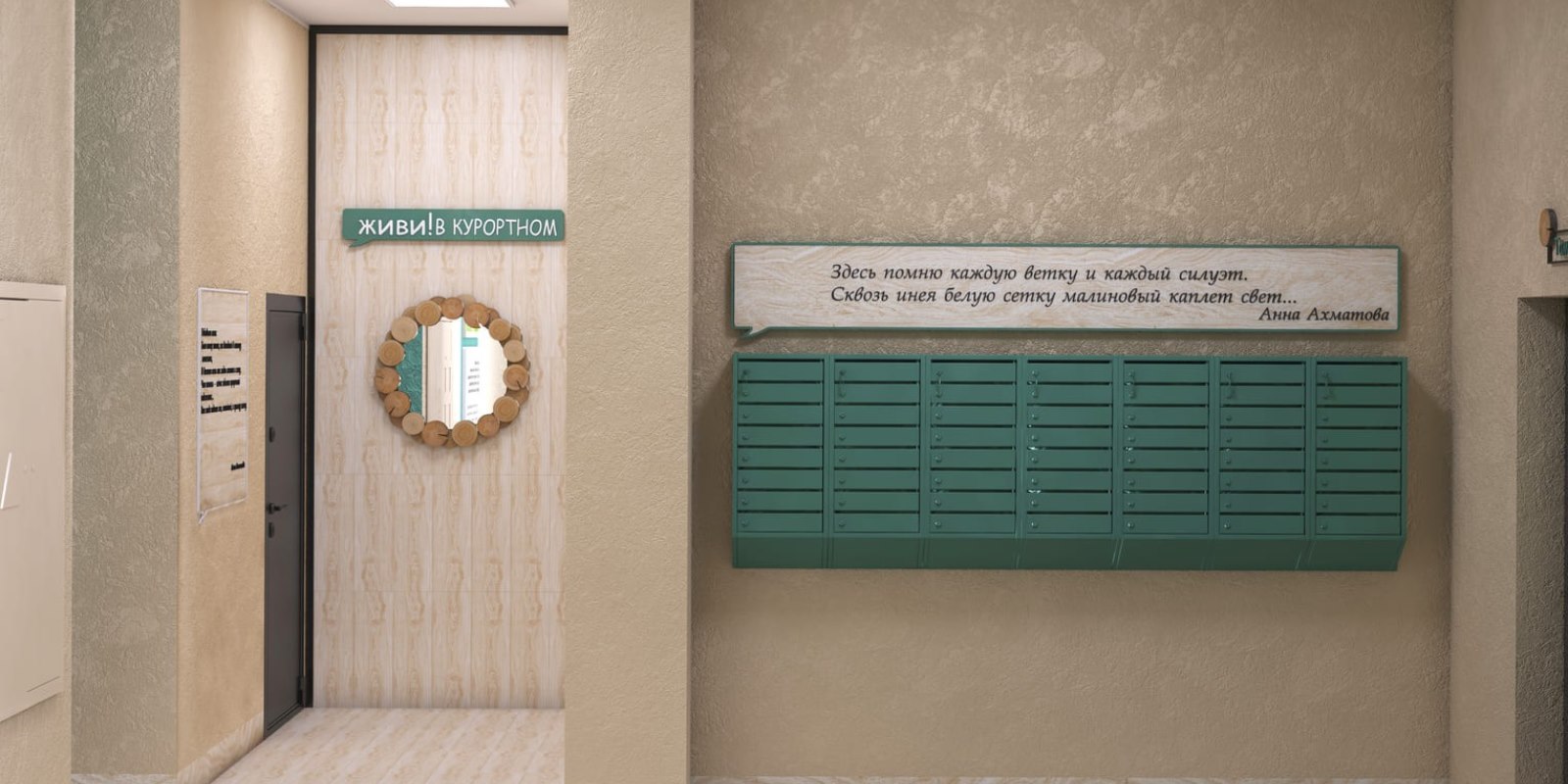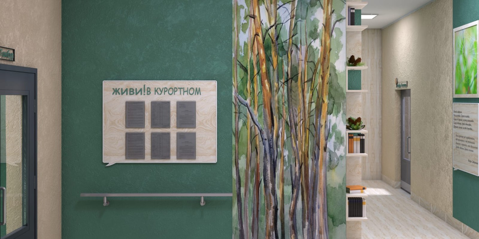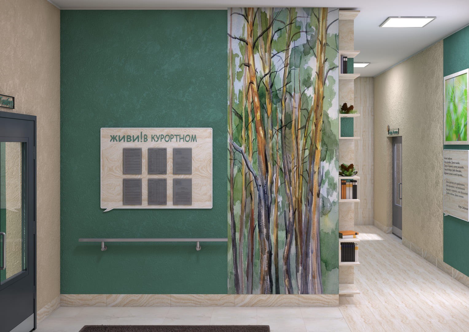 Места общего пользования оформлены под фрагменты карельского леса — мягкие цвета северной природы и древесные оттенки керамических элементов.