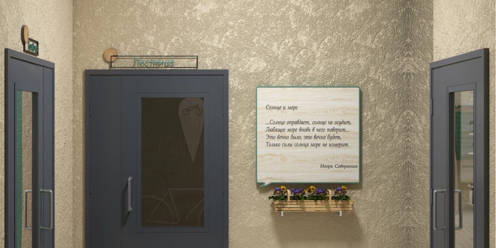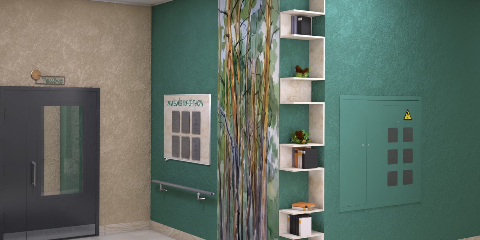 Дизайнерское оформление парадных, стилизованное под фрагменты карельского леса — мягкие цвета северной природы дополнены древесными оттенками керамических элементов.